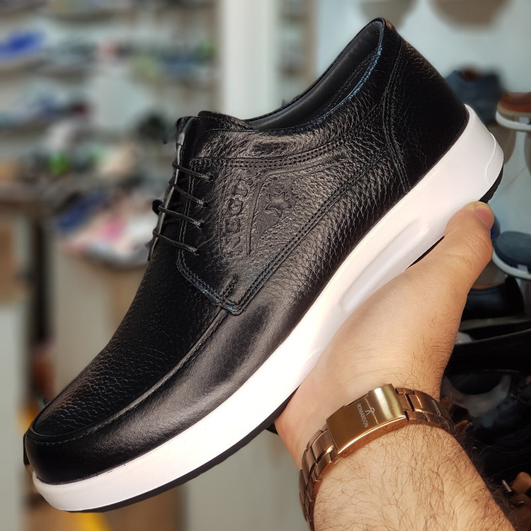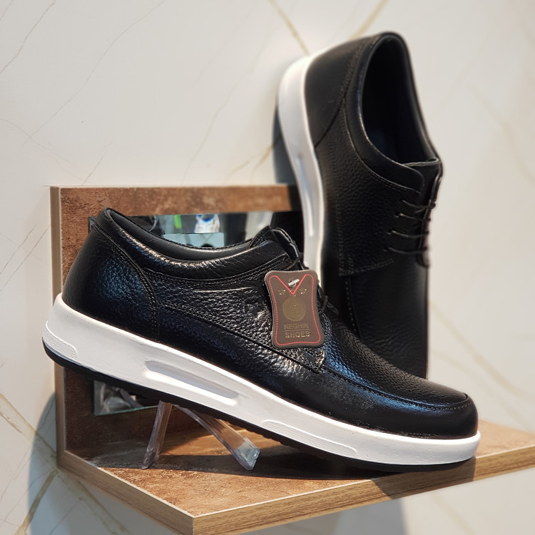 کفش تمام چرم طبیعی نگین مدل فلوتر بلک کفشی است دستدوز با استایل اسپورت و کژوال که جنس رویه این کفش از چرم طبیعی گاوی درجه 1 و جنس آستر این کفش از تمام چرم بزی ضد تعریق و جنس زیره این کفش ترموتی پی یو خارجی آنتی شوک و ضد سایش که به صورت کف دوخت مخفی و دور دوخت به رویه متصل شده است و جنس کفی این کفش طبی تمام چرم بزی آنتی باکتریال و ضد بو می باشد .این کفش از مرغوب ترین چرم و مواد اولیه ساخته شده است و دارای کیفیت و دوام بی نظیری می باشد و همچنین صادراتی می باشد